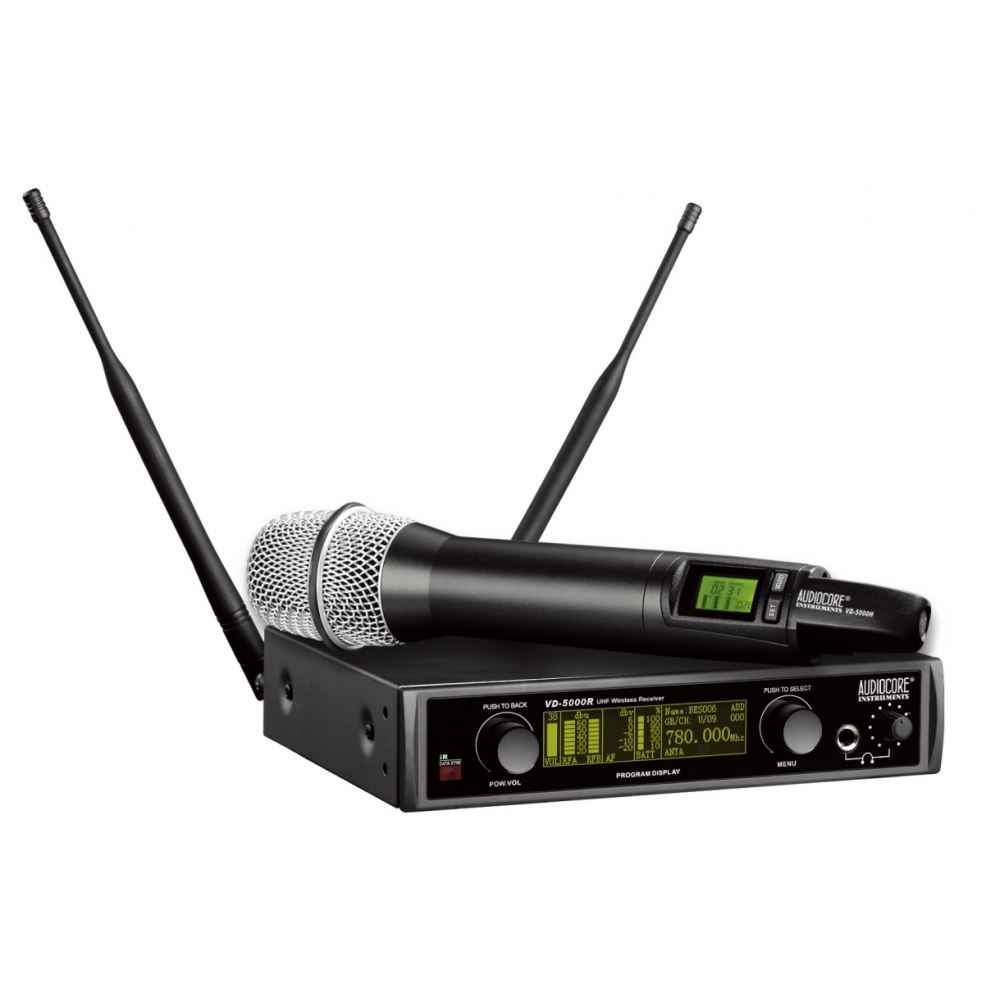 With its outstanding audio quality, the Audiocore VD-5000 Wireless System offers numerous potential applications for live performances and permanent installations. The working UHF frequency range is 734 MHz to 776 MHz. Both the handheld microphone and belt pack transmitter versions ensures any vocalist, speaker or instrumentalist optimal transmission of his or her performance whilst providing the greatest possible freedom of movement. By means of a threaded connection, the microphone head of the handheld transmitter can be swapped quickly and easily (dynamic and condenser capsules).