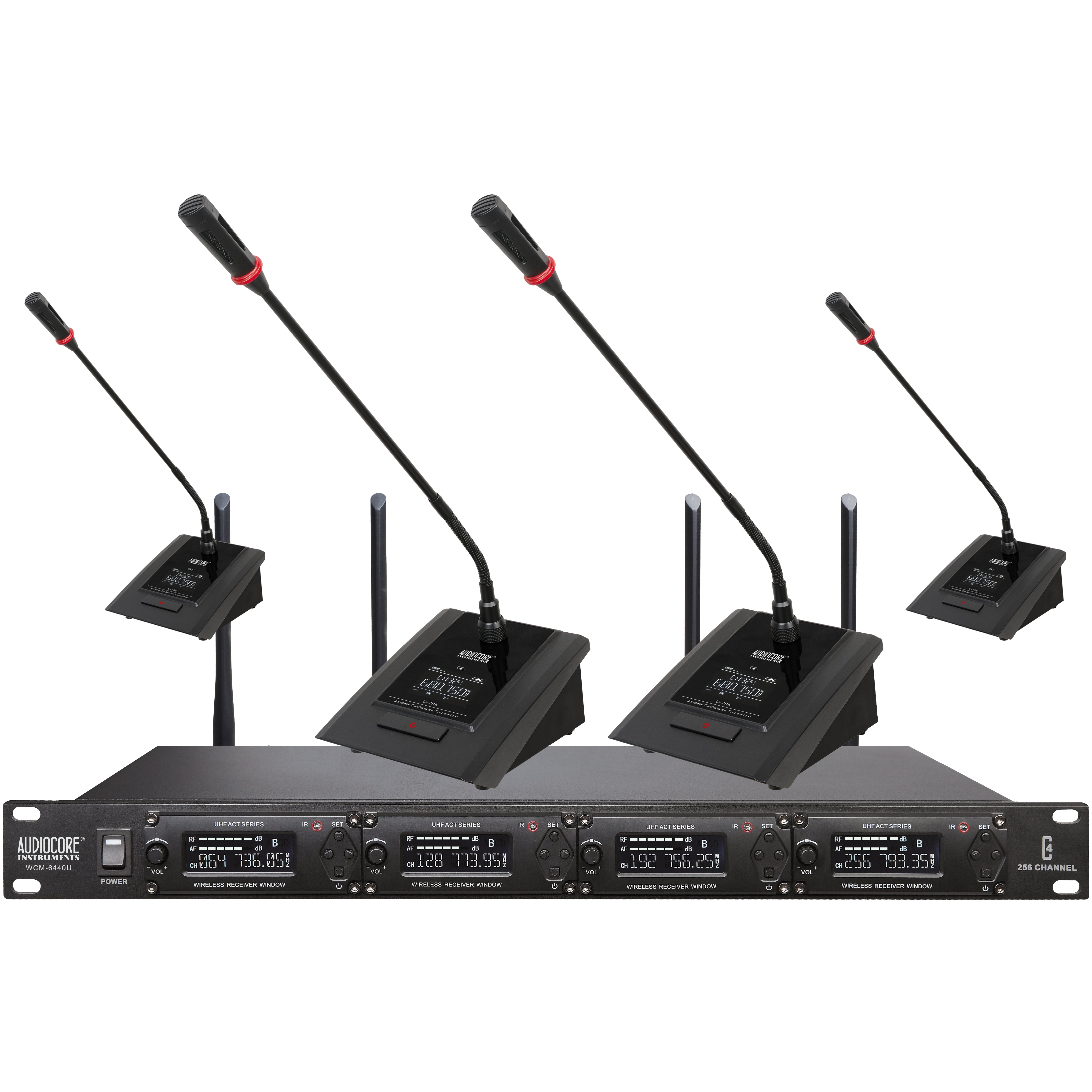 The Audiocore WCM-6440 is built using the latest technology for Wireless Conference System, with high end wireless modules and phase lock-up frequency to ensure the clarity of the signal and interference-free audio. This product is suitable to be used in large meeting venues or office meetings. It has a greater range and clarity than its sibling the Audiocore WCM-3240U.