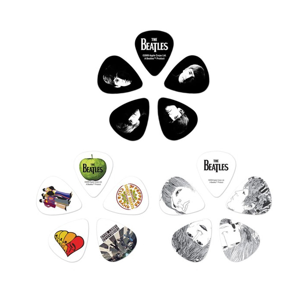 The Beatles Guitar Pick Tins feature 15 guitar picks from the "Meet The Beatles," Classic Albums, and "Revolver" guitar pick packs. All in medium gauge celluloid guitar picks in a tin with 3 unique designs.