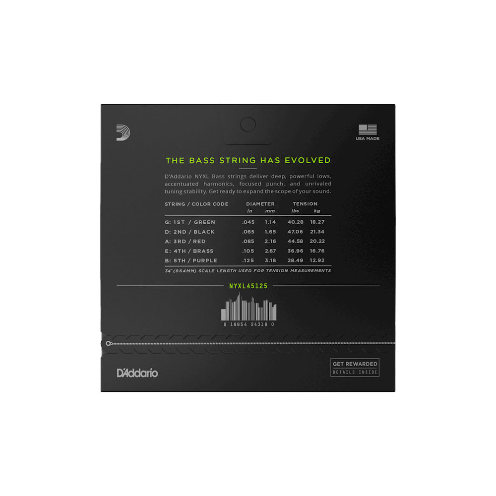 NYXL bass guitar strings thump harder, bend farther and sound thicker than any bass string you’ve played before. As our premium uncoated bass string, NYXL bass strings provide higher break strength, enhanced tuning stability, and accentuated harmonics where it counts. Using a NY Steel core, Fusion Twist technology, and premium nickel-plated steel wrap wire, with a reengineered core-to-wrap ratio, NYXL bass guitar strings deliver extra versatility, familiar feel, and a boosted tone that’ll expand the scope of your low-end. This 45-105 Regular Light Top/Medium Bottom gauge set has a great mix of tighter low-end with a comfortably balanced, bright top.