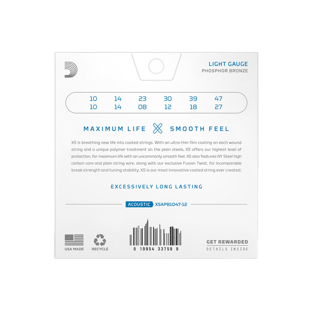 Born from our greatest breakthrough in string innovation, XS Phosphor Bronze strings have the longest life of any D’Addario acoustic guitar string. The XS coating gives our warm, balanced phosphor bronze strings maximum life, with an uncommonly smooth feel. Made with a NY Steel core, phosphor bronze wrap wire and Fusion Twist technology, XS coated acoustic guitar strings have incomparable break strength and tuning stability, in addition to their dramatically increased lifespan. This 10-47 Light gauge 12-string set is great for 12-string acoustic guitars.