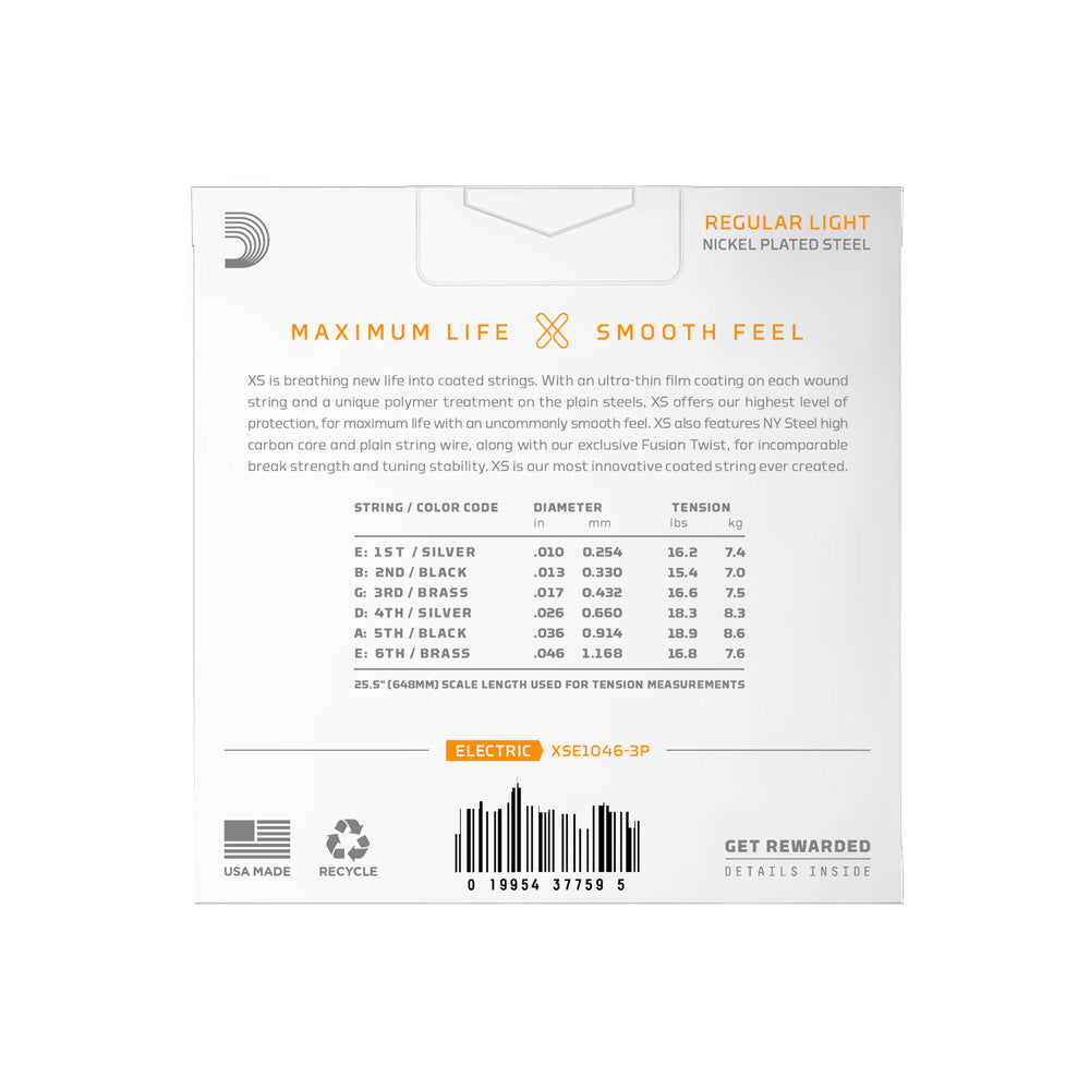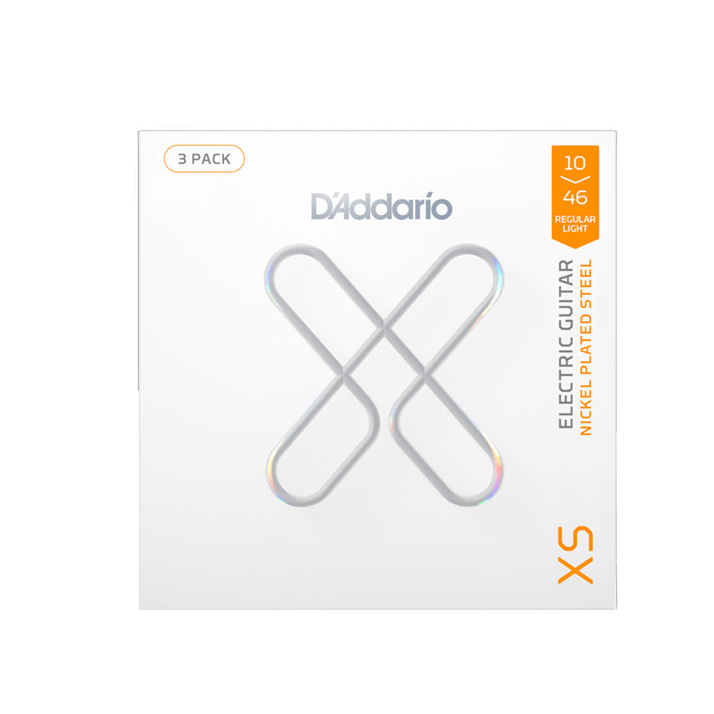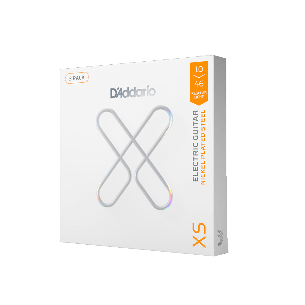 XS Nickel coated electric guitar strings provide the longest life of any D’Addario electric guitar string. Coated with our groundbreaking XS coating, these premium electric strings attain maximum life and a smooth, fast feel without dampening their outstanding tone. Constructed with a NY Steel core, reformulated nickel-plated steel wrap wire, and Fusion Twist technology, XS Nickel strings boast superior strength and tuning stability, plus richer harmonics, greater clarity, and remarkable definition with every sweep, slide, and bend. 10-46 Regular Light is our most popular electric gauge, providing a nice balance of tone and playability.