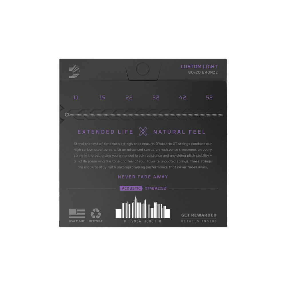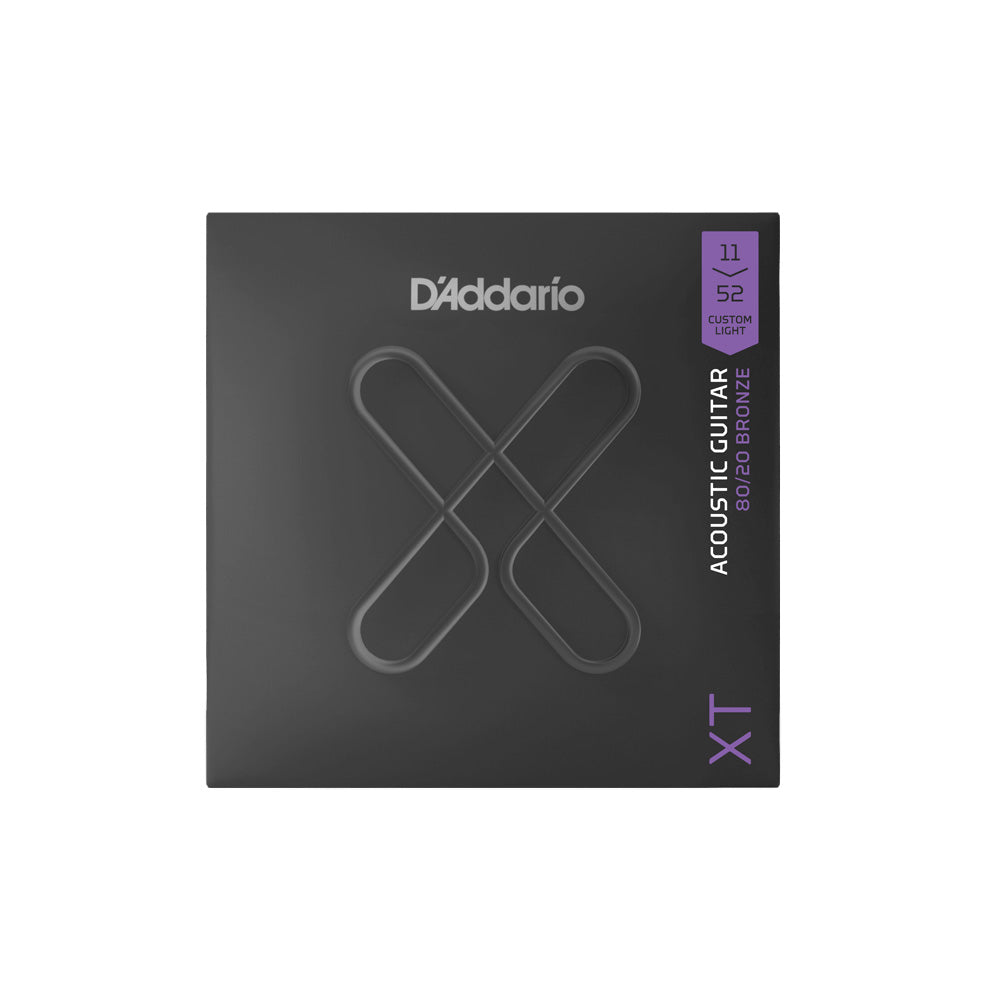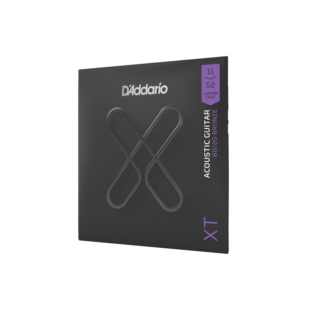 80/20 Bronze are our brightest acoustic strings, made to give your guitar an unparalleled shine. With the addition of our XT coating, these 80/20 strings obtain advanced corrosion resistance, resulting in an increased lifespan compared to standard acoustic strings. XT 80/20 Bronze strings are constructed with a NY Steel core, 80/20 bronze wrap wire, and Fusion Twist technology which, in addition to lasting longer, allows them to defy breakage and maintain pitch better, all while preserving the bold, bright tone 80/20 is known for. This 11-52 Custom Light gauge set has slightly more volume and projection than Extra Light, while still being easy to play.