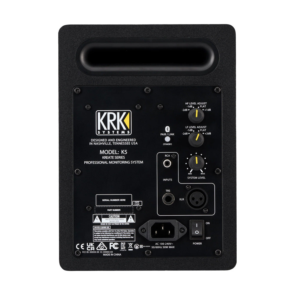 KRK KREATE 5 juga dilengkapi Bluetooth, memudahkan koneksi langsung dari smartphone, laptop, atau tablet tanpa kabel. Tersedia input balanced TRS dan unbalanced RCA, sehingga kompatibel dengan audio interface, mixer, soundcard, maupun perangkat audio lainnya. Fitur EQ digital dengan layar LCD memungkinkan penyesuaian suara sesuai karakter ruangan, membuat hasil monitoring lebih akurat.