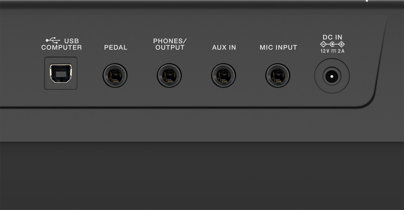 Konektivitas lengkap termasuk headphone jack, input pedal sustain, serta port eksternal untuk koneksi ke perangkat lain.
