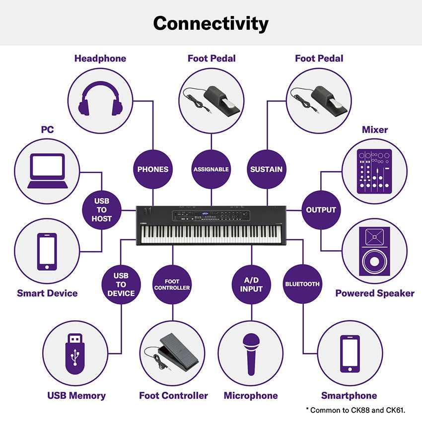 Yamaha CK88 juga dilengkapi dengan speaker stereo internal yang powerful, koneksi Bluetooth Audio, input mic/gitar combo, serta USB Audio Interface dan Playback via USB. Anda bisa langsung tampil hanya dengan CK88 tanpa perlu bawa speaker tambahan. Dengan konektivitas lengkap dan kemampuan rekam/memutar file audio, CK88 sangat cocok untuk musisi panggung, wedding singer, worship team, hingga performer solo yang membutuhkan perangkat serbaguna dengan kualitas Yamaha.